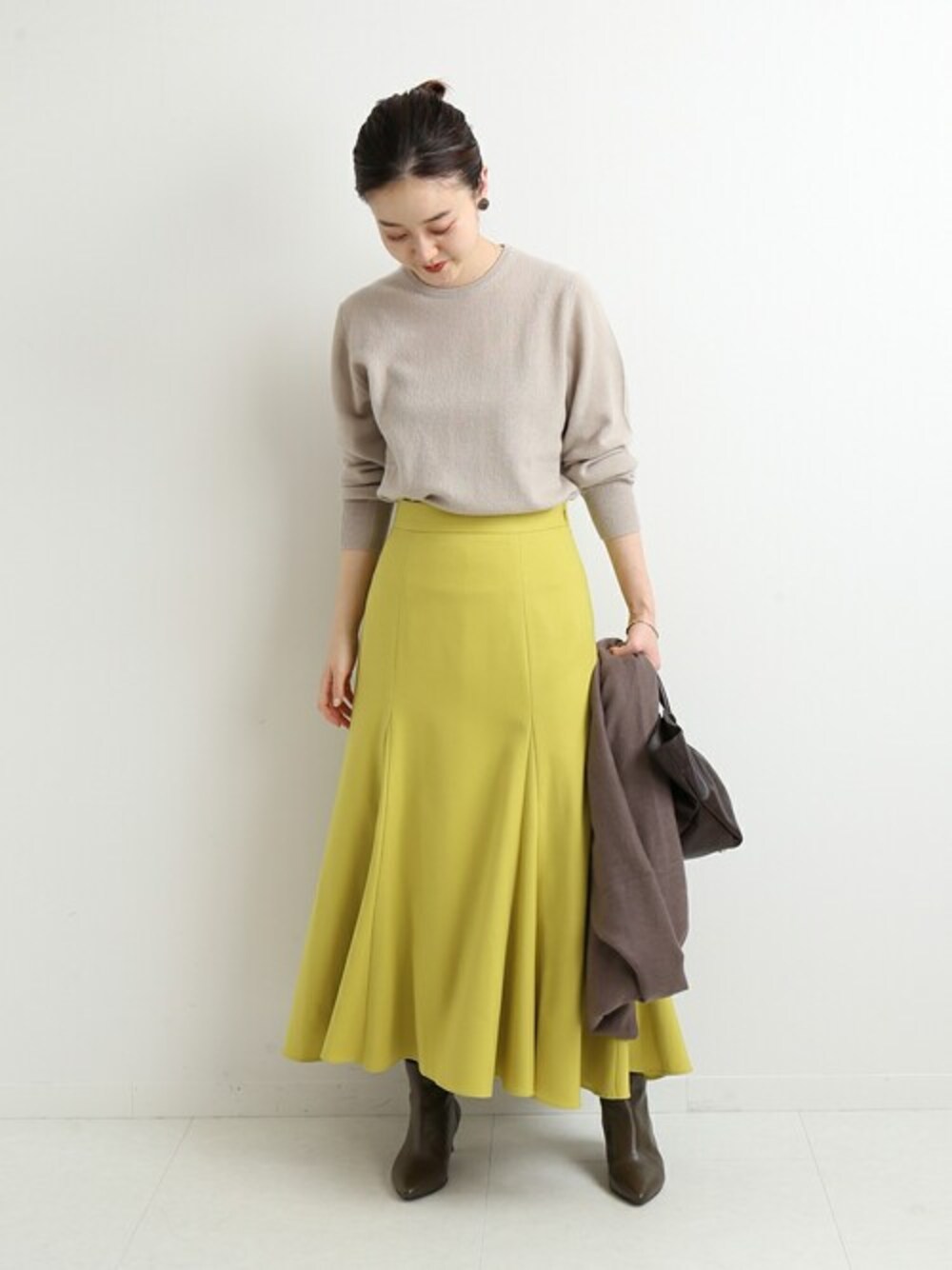 毎年大人気のカシミヤシリーズ。 柔らかいベージュのカラーに、パキっとしたイエローのスカートを合わせて華やかに。 形がシンプルなので、どんなボトムスとも合わせやすく、色違いで持っていても間違いないアイテムです◎