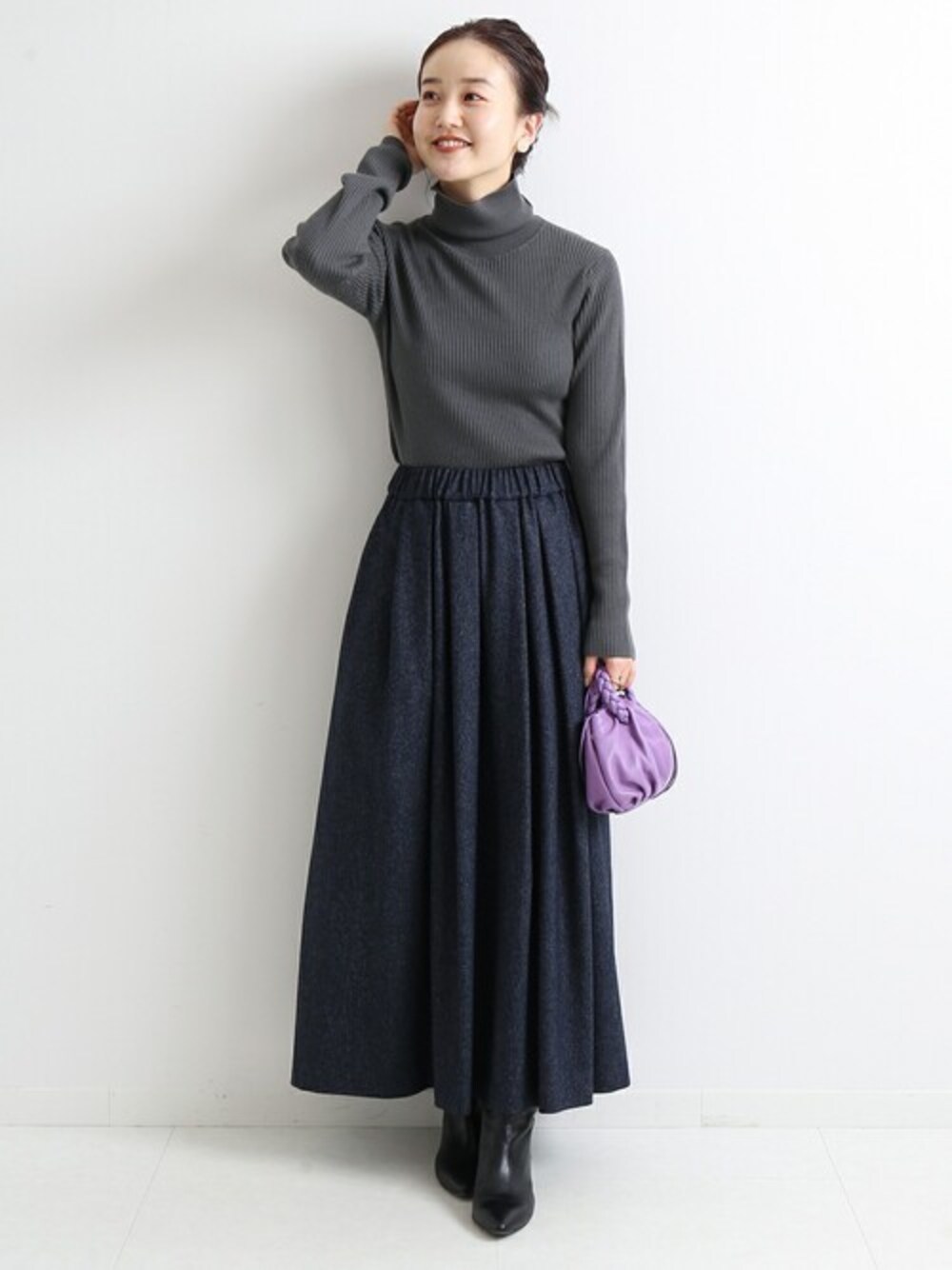 インディゴデニムのような風合いが素敵なロングスカート。 スカートにボリューム感があるので、トップスはコンパクトなリブニットでバランスを取りました。 パープルのバッグで華やかさをプラス◎