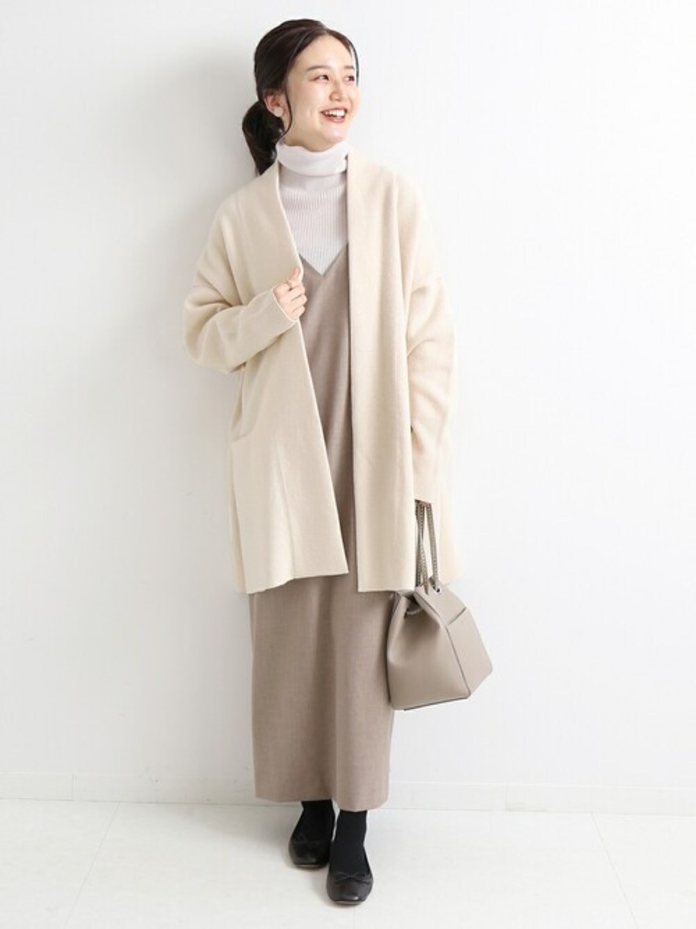 大人気のガウンカーディガンが追加予約開始! 新色のホワイトはより色が明るくなり、どんなアイテムと合わせても華やかに仕上がります。 ベージュ系のワントーンでまとめるとより女性らしさがアップ◎