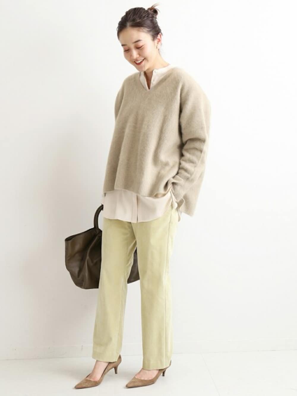 毎年人気のラクーン素材のプルオーバー。 ふわふわな着心地ながら、毛が抜けにくいところが人気のポイントです。 Vネックニットは着丈がややコンパクトなので、中にシャツやカットソーをレイヤードするのもお勧め◎ まろやかなイエローのパンツと合わせてまとまりがありつつこなれ感のあるスタイリングにしました。