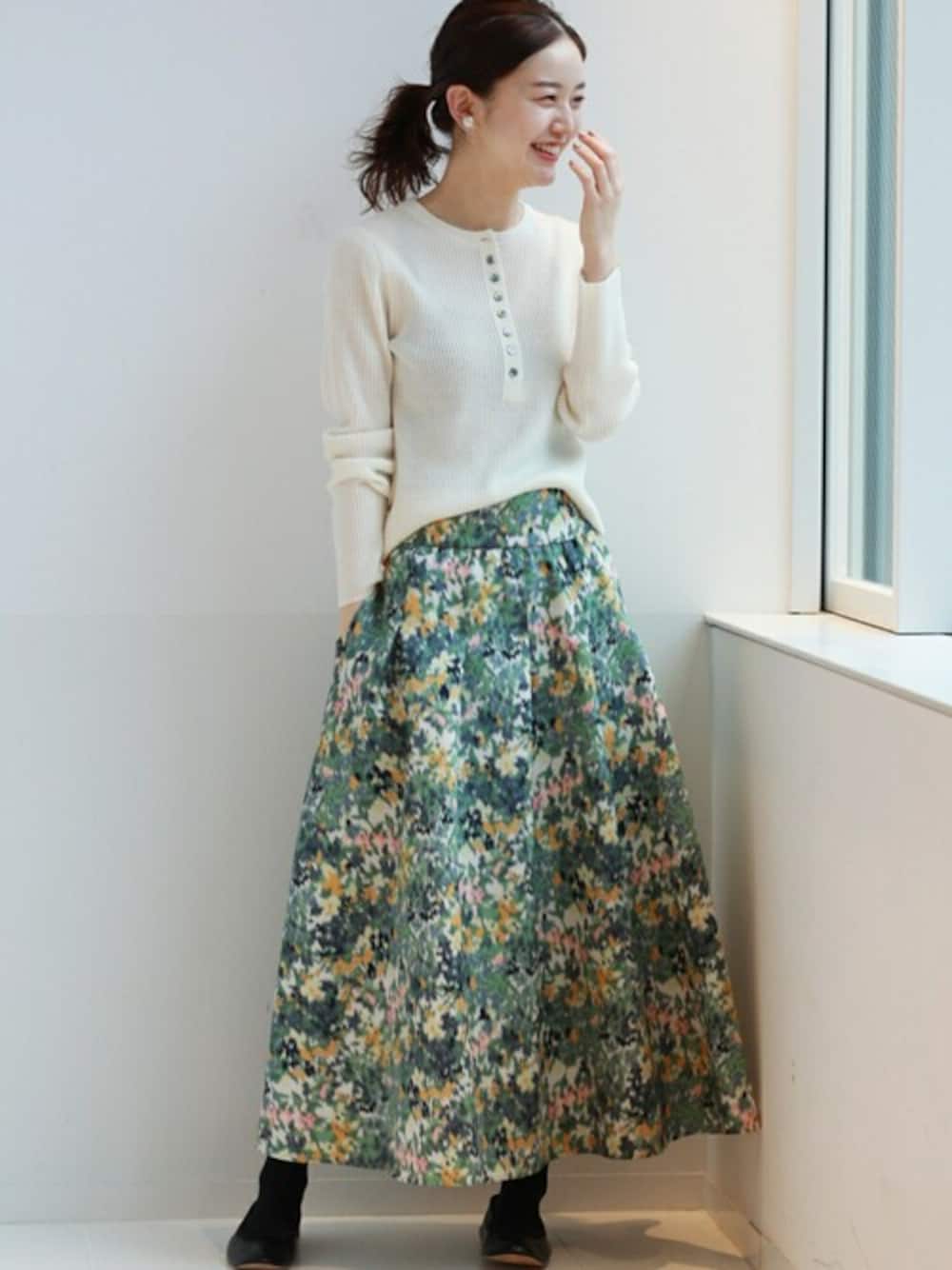 大人気のリブシリーズのヘンリーネック。 ボタンがポイントになるので、着るだけでシンプルすぎずこなれた雰囲気に! ボリュームスカートと合わせればフィット&フレアの美シルエットが完成です◎