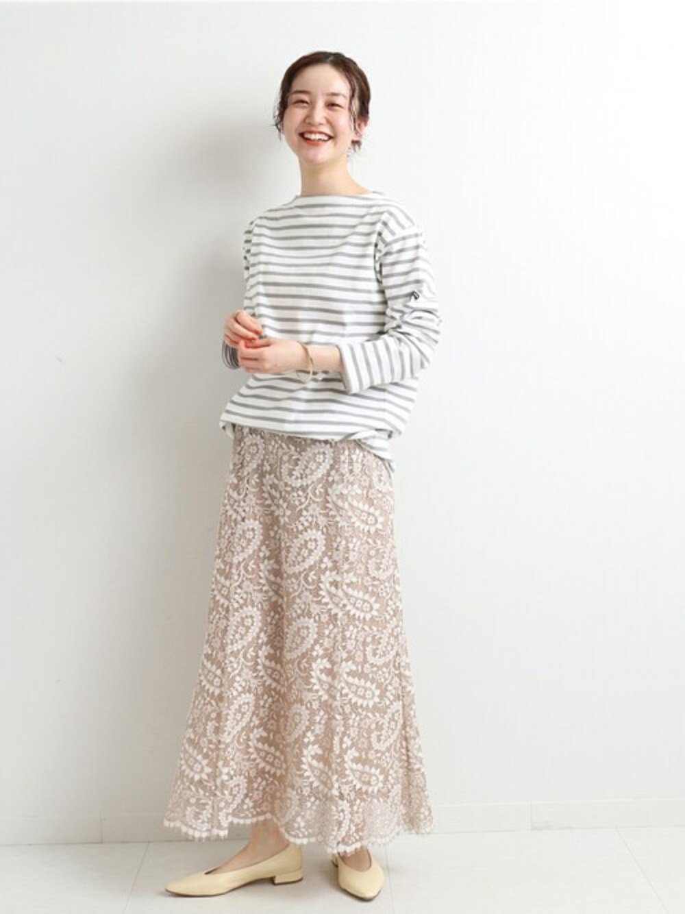 【SAINT JAMES / セント ジェームス 別注 OUESSANT ボーダーカットソー】 グレーのボーダーにレーススカートを合わせたニュアンストーンのコーディネート。 柔らかなカラーの組み合わせなのでウエストは軽くインしてシルエットでメリハリを。 フェミニンなレースのスカートにボーダーを合わせることでデイリー仕様にカジュアルダウンしました◎