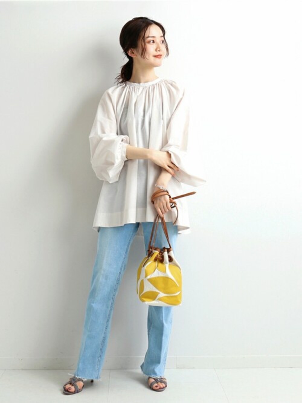 【YANUK/ヤヌーク 別注 セミフレアパンツ】 大人気のYANUK別注デニムパンツに新色が登場! いつものデニムを明るいカラーにシフトチェンジするだけでぐっと春らしい印象に◎ イエローの効いたバッグをポイントにしてシンプルながらもこなれ感のあるスタイリングにしました。