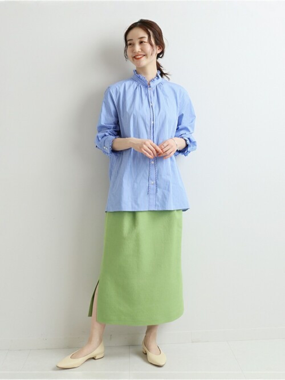 【コットンフリルシャツブラウス】 大人気のコットンフリルシャツブラウスに新色が登場! サックスブルーベースにピッチの細いホワイトのストライプは着るだけで洗練された印象に。 ビビッドなグリーンのタイトスカートで色使いを楽しんで◎ カラーで遊ぶスタイリングの時は肌馴染みの良いシューズを選ぶのがポイントです。