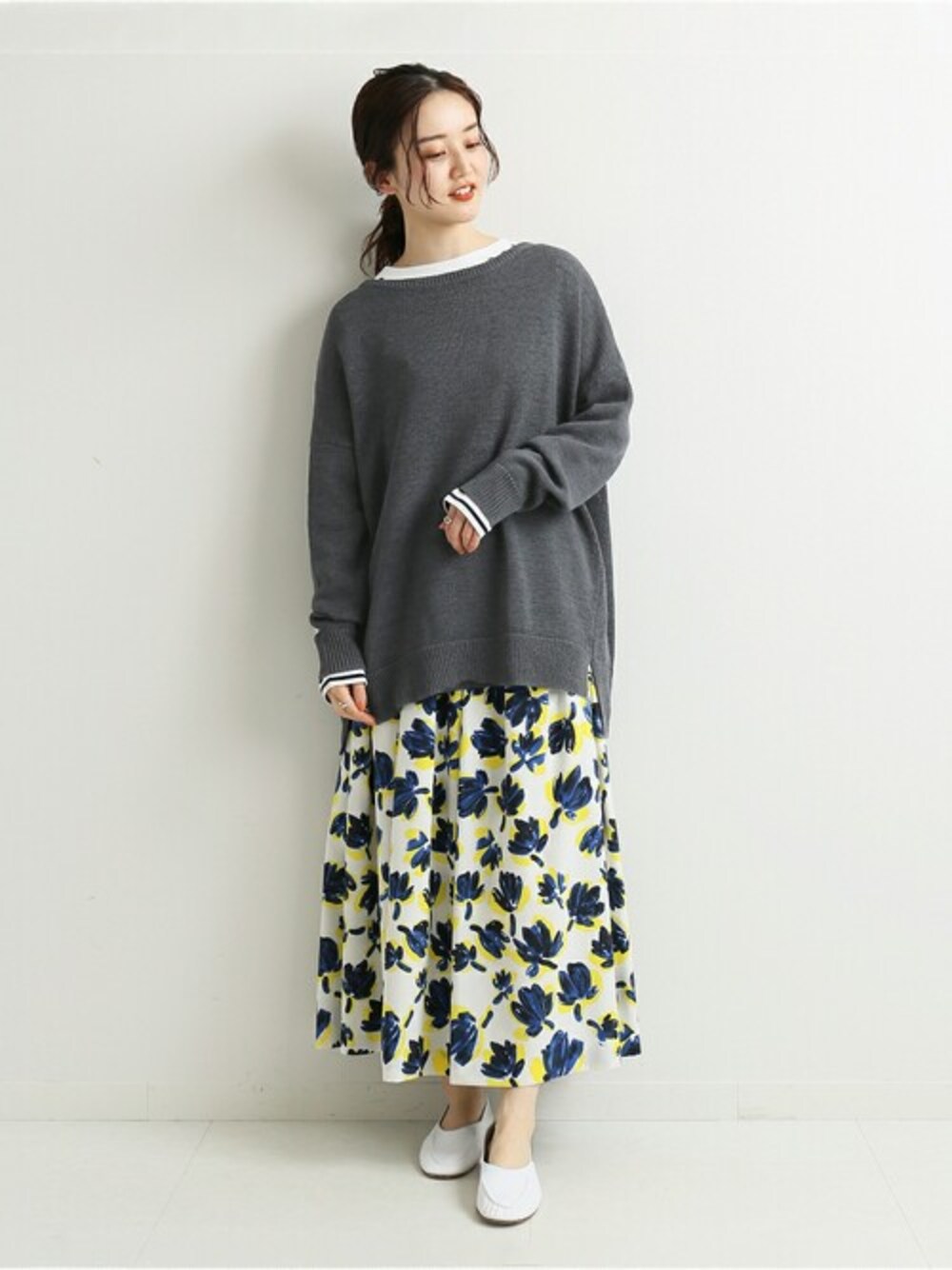 【テープヤーン ワイドクルーネックプルオーバー】 表情のある編み地で1枚でも着映えするプルオーバー。 ゆったりとしたシルエットでとても着やすく、ついつい手を伸ばしてしまうアイテムです。 ボーダーのカットソーをレイヤードしてさりげなく襟ぐりや袖からみせてポイントに◎