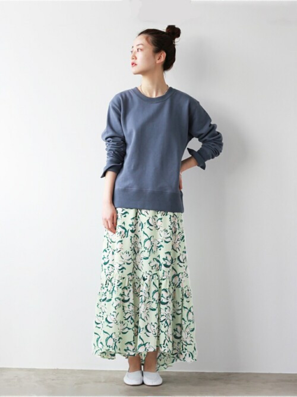 【ギャザーティアードスカート】 広がりすぎないギャザーシルエットが上品なフレアスカート。 優しいミントグリーンの花柄は意外にもトップスの色を選ばず合わせやすい◎ スウェットと合わせてデイリー仕様に。