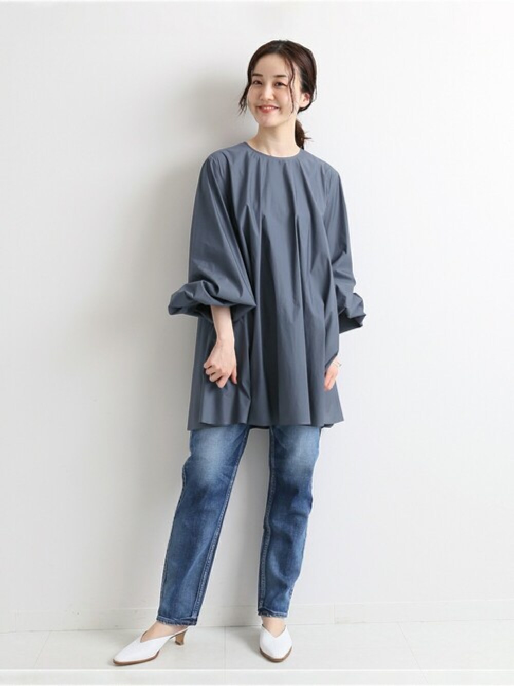 【CO/PE ボリューム ブラウス】 気分のあがるボリューム感のたっぷりの主役級ブラウス。 ニュアンスブルー×インディゴのデニムを合わせた簡単かつこなれて見えるワントーンコーディネート◎ ホワイトのシューズで春らしく!