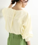 【ボリュームスリーブ ブラウス】 袖のデザインとバックボタンがポイントのブラウス。 前かけて後ろにかけて袖のボリュームが増えるデザインで、見た目よりもすっきりと着こなせます。 カスタードのようなまろやかなイエローにビビッドなグリーンのスカートを合わせたプレイフルなスタイリング。 トップスにボリュームがある分、ボトムスはタイトシルエットでメリハリを付けました。