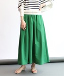 華やかなグリーンのスカートはボーダーと合わせたフレンチスタイルに。 微光沢で少しきれいめなデザインに仕上がっています。 オンオフで合わせやすく、グリーンは取り入れるだけでコーデに鮮度が出るのでおすすめ! ウエストはゴムで楽ちんなのも嬉しいポイントです。 シーズン問わず使える素材なので夏はサンダル合わせで◎。