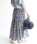 BACK LOGO Tシャツ 身長:162cm/体型:細身/骨格:ウェーブ/普段のサイズ:S/着用サイズ:free/パーソナルカラー:イエベスプリング サイズ感:程よくゆったりした形で着やすく、着丈はヒップにかかる大きさ。 素材感:高密度に編み立てることで透けにくく適度に張りがある素材感。 着用感:一枚で涼しく着用できます。インしても可愛いゆったり感。 テガキプリントティアードイージースカート 身長:162cm/体型:細身/骨格:ウェーブ/普段のサイズ:S/着用サイズ:36/パーソナルカラー:イエベスプリング サイズ感:ボリュームがありながらも落ち感があり、腰下の切り替えでウエスト周りはすっきり着ていただけます。 素材感:さらりとした手触り、ボリュームのあるスカートも重たく見えない印象。 着用感:ウエストがゴムなので履きやすく、夏も涼しくお召しいただけます。