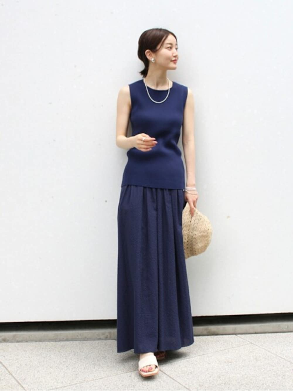 サッカーギンガムデザインスカート 身長:162cm/体型:痩せ型/普段サイズ:S/着用サイズ:36 サイズ感:ウエストは後ろがゴム仕様で着やすくインしてもゴムなど気にならずに着用できました。 素材感:ぽこぽことした表面感のある軽やかな素材。透け感は気になりませんでした。 着用感:スリットが入っているのでロングスカートでも軽やかに見え涼しい印象。腰周りはギャザーですがボリュームがありすぎずすっきりしてます。 RIB ニットノースリーブ 身長:162cm/体型:細身/骨格:ウェーブ/普段のサイズ:S/着用サイズ:F/パーソナルカラー:イエベスプリング サイズ感: 詰まったネックと肩も程よく、厚みがあり体のラインを拾いにくいです。 素材感:柔らかな素材感で着やすいです。 着用感: 羽織りのインナーや、夏は一枚でも着やすいので着回しやすいアイテムです。