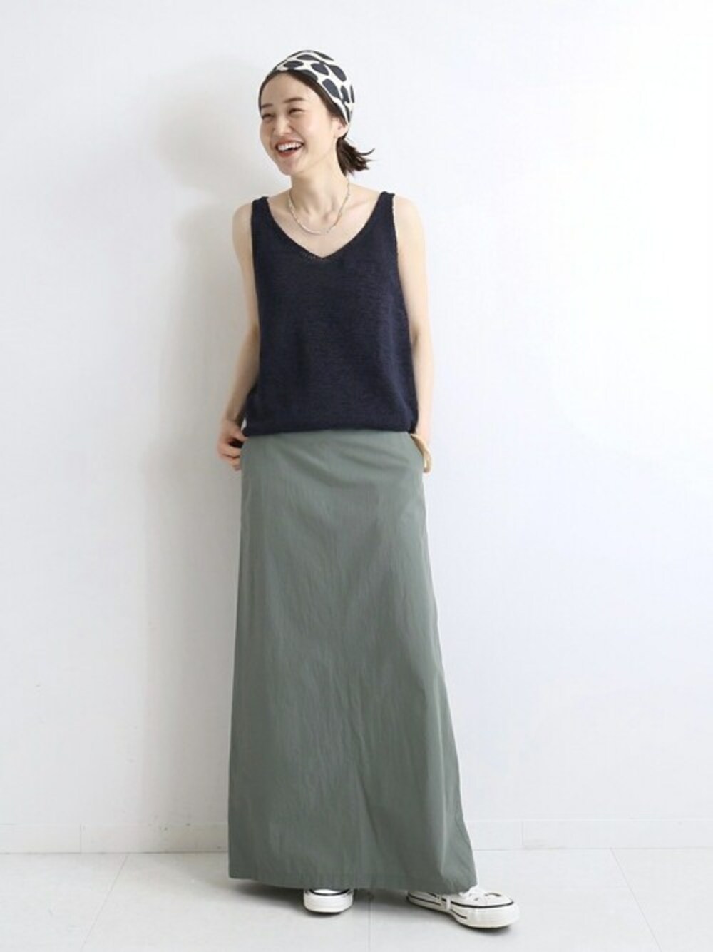 ナイロンコットントラペーズスカート 身長:162cm/体型:細身/骨格:ウェーブ/普段のサイズ:S/着用サイズ:36/パーソナルカラー:イエベスプリング サイズ感:ウエストはトップスがインできるようなゆとりがあり、踝にかかる丈感。すっきりとしたロングスカートです。 素材感: ナイロンの光沢とシボ感が独特でハリ感のある素材感。裏地がなく、夏もさらりと着れそう。 着用感:裏地はないのですが、生地が体から離れるので透け感などは気になりませんでした。綺麗めすぎないカジュアルなタイトスカートなのでトップスの組み合わせも楽しめそう。