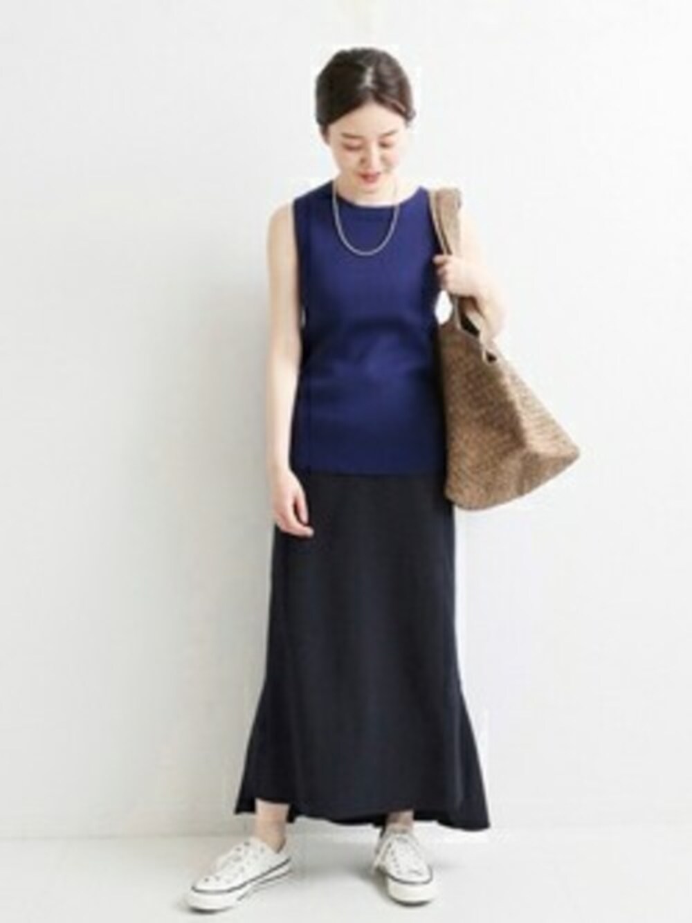 RIB ニットノースリーブ 身長:162cm/体型:細身/骨格:ウェーブ/普段のサイズ:S/着用サイズ:F/パーソナルカラー:イエベスプリング サイズ感: 詰まったネックと肩も程よく、厚みがあり体のラインを拾いにくいです。 素材感:柔らかな素材感で着やすいです。 着用感: 羽織りのインナーや、夏は一枚でも着やすいので着回しやすいアイテムです。 ギンガムカットソーマーメイドスカート 身長:162cm/体型:細身/骨格:ウェーブ/普段のサイズ:S/着用サイズ:36/パーソナルカラー:イエベスプリング サイズ感:シルエットは綺麗なまま、着用感は締め付けられることなく楽に着用できました。 素材感:表情感のあるカットソーの生地で着心地よく、ケアも楽にしていただけます。 着用感:軽い素材感で夏も涼しくお召いただけます。