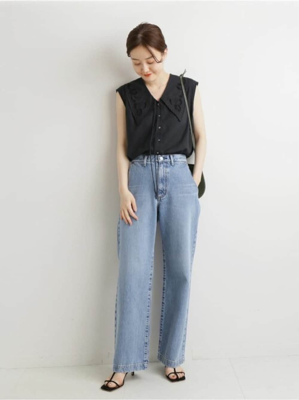 レース刺繍カラーブラウス 身長:162cm/体型:細身/骨格:ウェーブ/普段のサイズ:S/着用サイズ:free/パーソナルカラー:イエベスプリング サイズ感:着丈も長めで身幅にゆとりがあり。脇の辺りは少し開き感がありましたが気にならない程度でした。 素材感: 軽めのコットンでサラッとした素材感。夏も涼しく着れそうです。 着用感: 大きめの襟のデザインがレトロなムードで、カジュアルなアイテムとの着こなしにもおすすめです。 エコデニムソフトバギーパンツ 身長:162cm/体型:細身/骨格:ウェーブ/普段のサイズ:S/着用サイズ:36/パーソナルカラー:イエベスプリング サイズ感:全体的少しゆとりがあり、個人的にバギーパンツなので、34サイズのが綺麗に履けそうです。 素材感: デニムですが硬さはなくやわらかく、履きやすいです。 着用感: ハイウエストで腰位置を高く見せつつ、足のラインを拾わず体型カバーも出来ておすすめ。