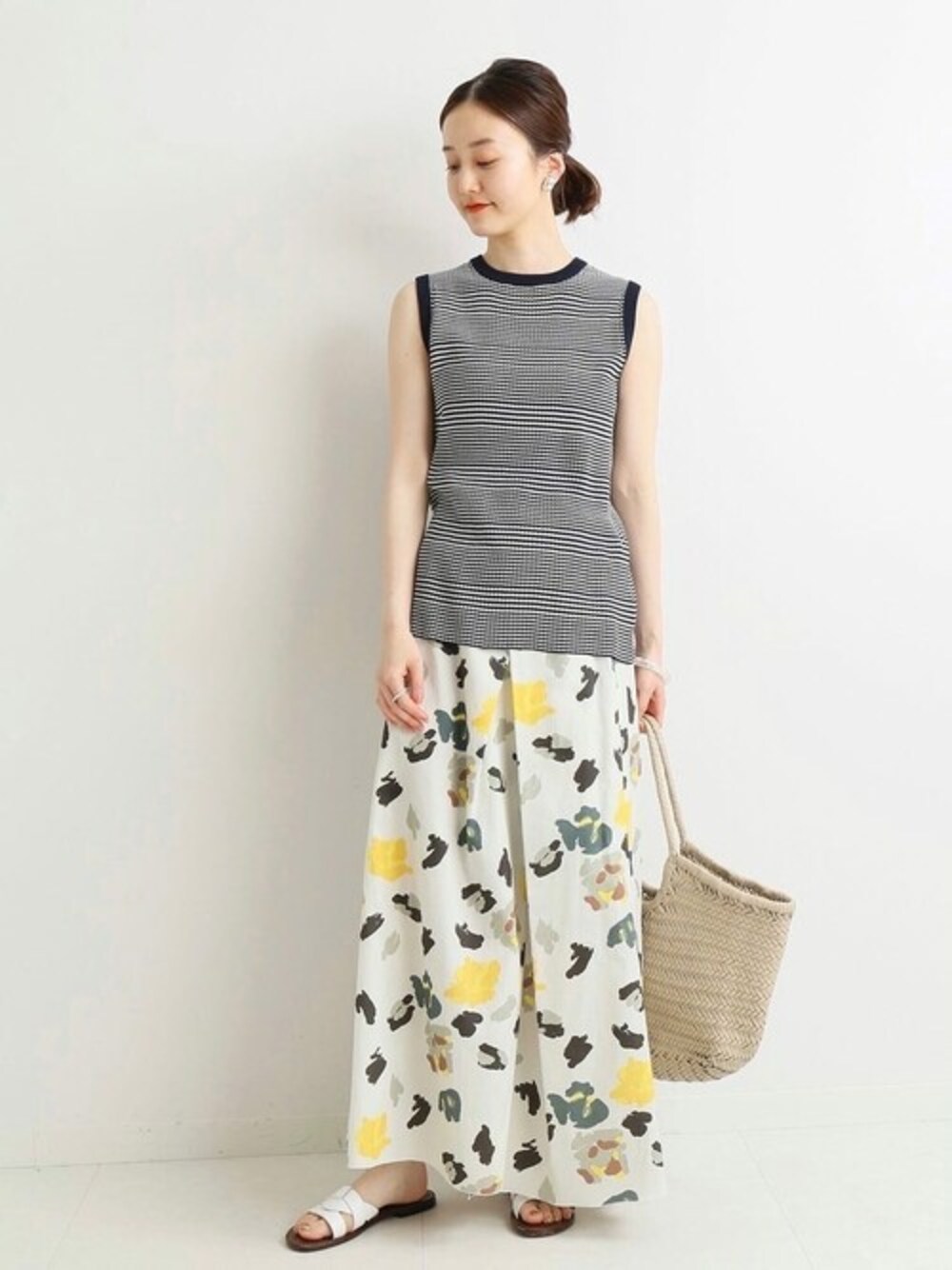 シューフラワースリットスカート 身長:162cm/体型:細身/骨格:ウェーブ/普段のサイズ:S/着用サイズ:36/パーソナルカラー:イエベスプリング サイズ感: 長さも足首までくる長さでウエストもインできるぐらいのゆとりがありました。 素材感: サラッと軽い素材感。シーズン問わず使えそうな素材感です。 着用感: スリットが入っており、ロング丈でも足捌きが良く動きやすいシルエットでした。 ハイツイストリブボーダープルオーバー 身長:162cm/体型:細身/骨格:ウェーブ/普段のサイズ:S/着用サイズ:free/パーソナルカラー:イエベスプリング サイズ感:身体のラインを拾わず、ノースリーブですが袖も肩に少しかかるぐらいです。 素材感:柔らかい素材感で着心地が良かったです。 着用感:涼しく着れますので夏~秋にかけて着れそうな1枚です。