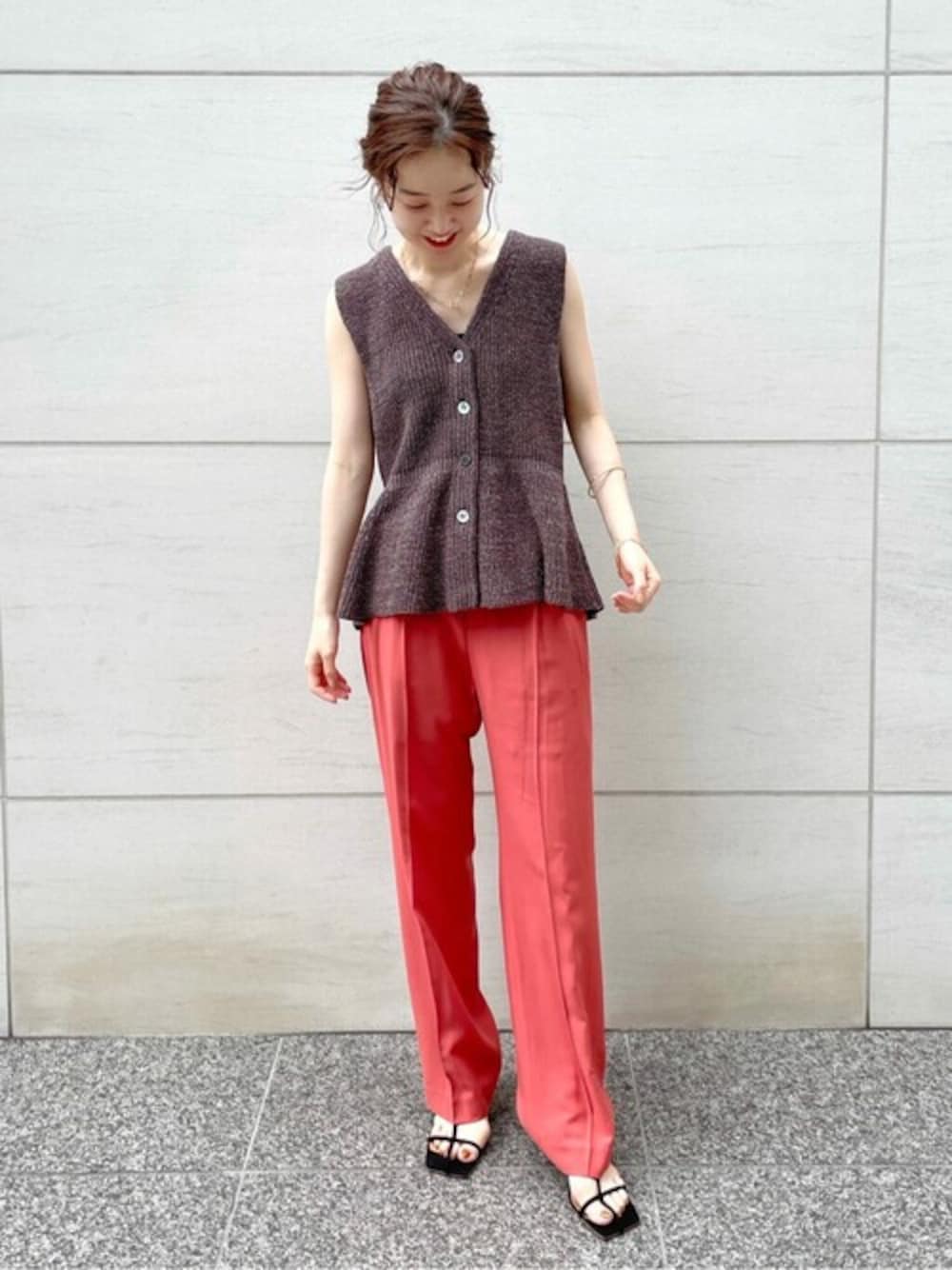 エコフィルビエラパンツ 身長:162cm/体型:細身/骨格:ウェーブ/普段のサイズ:S/着用サイズ:34/パーソナルカラー:イエベスプリング サイズ感:ウエストが36サイズに比べるとインできるぐらいの多少のゆとり。フラットだと足に少し溜まるぐらいのゆるさはあり、ヒールを履くと綺麗に丁度良い長さ。 素材感: 柔らかくとろみのある素材感で落ち感が綺麗です。 着用感:全体的にゆったりしているのでルーズなシルエットを楽しむことができます。 テープヤーンスソフレアVネックプルオーバー 身長:162cm/体型:細身/骨格:ウェーブ/普段のサイズ:S/着用サイズ:free/パーソナルカラー:イエベスプリング サイズ感:程よいゆとりがあります。丈もヒップぐらいのインせずに着れる長さです。 素材感:立体感のでる素材感です。裾のみフレアに広がるニットはチクチクせず、夏も涼しくお召し頂けます。 着用感: Vネックの開き感がややあるのでインナーはしっかり入れて頂くことをオススメ致します。Tシャツやタンクトップなど入れて頂いても◎