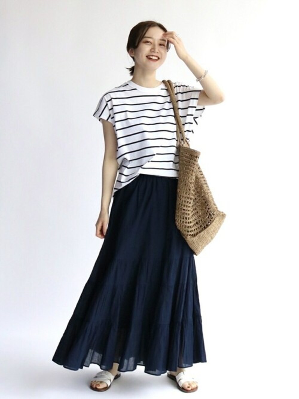 コットンボイルスカート 身長:162cm/体型:細身/骨格:ウェーブ/普段のサイズ:S/着用サイズ:36/パーソナルカラー:イエベスプリング サイズ感:ウエストゴムでしっかりしており、ピッタリしていて履きやすいです。 素材感: インド綿ならではの一度洗いざらした軽やかな生地感。夏にさらっと涼しく着れます。 着用感: 腰回りは広がらないシルエットなのでスッキリ着て頂けます。 ラウンドテールプルオーバー 身長:162cm/体型:細身/骨格:ウェーブ/普段のサイズ:S/着用サイズ:free/パーソナルカラー:イエベスプリング サイズ感: 着丈は後ろはヒップを覆う安心の丈感で、インでもアウトでも着やすいです。 素材感: さらっとしたコットン素材で透け感も無く、夏は1枚で涼しく着れます。 着用感: 体のラインが出ない程よいゆとりのあるシルエットです。