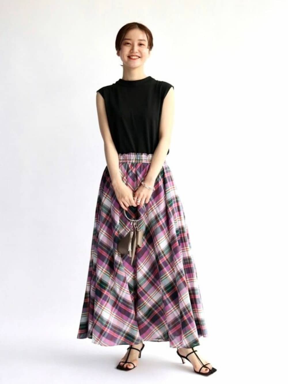 チェックギャザースカート 身長:162cm/体型:細身/骨格:ウェーブ/普段のサイズ:S/着用サイズ:free/パーソナルカラー:イエベスプリング サイズ感:ウエストゴムでしっかりしており、長さも足首が見えるぐらいで丁度良く履きやすいです。 素材感: コットンの軽やかな生地感。夏にさらっと涼しく着れます。 着用感:ボリュームは少しあるように見えますが、腰回りは広がらないシルエットなのでスッキリ着て頂けます。 バックボウノースリーブプルオーバー 身長:162cm/体型:細身/骨格:ウェーブ/普段のサイズ:S/着用サイズ:free/パーソナルカラー:イエベスプリング サイズ感:ノースリーブですが肩に掛かるくらい長さはあり、コンパクトめのシルエットですが、体のラインを拾いすぎずないので着やすいです。 素材感:薄手の光沢感のあるカットソーで涼しく着られます。 着用感: シンプルだけど、後ろのボウタイがアクセントになり一枚着でも華やかな印象になります。