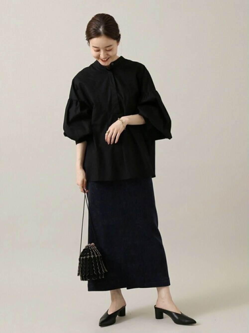 【MIRKO BERTOLA/ミルコベルトラ】 ボリュームスリーブブラウス 身長:162cm/体型:細身/骨格:ウェーブ/普段のサイズ:S/着用サイズ:free/パーソナルカラー:イエベスプリング サイズ感:着丈はヒップが隠れるぐらいの長さですので身幅や袖周りなど全体的に少しゆったりめですが、バランスよくお召し頂けます。 素材感: 程よくハリ感を感じるシャツ素材。綺麗めな印象です。 着用感:一枚で様になるのでシンプルなボトムスとも合わせやすく、スカートでもパンツでも◎ コーデュロイジャージスカート 身長:162cm/体型:細身/骨格:ウェーブ/普段のサイズ:S/着用サイズ:36/パーソナルカラー:イエベスプリング サイズ感:ウエストがゴムでストレッチがきいていて履きやすく、着丈も長すぎないのでスッキリ見えます。 素材感:やわらかいコーデュロイ素材。晩夏からお使い頂けます。 着用感:ストレッチがきいており、リラックス感がありますのでおうち時間にも最適です。
