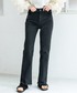【YANUK/ヤヌーク】別注セミフレアパンツ BLACK 身長:162cm/体型:細身/骨格:ウェーブ/普段のサイズ:S/着用サイズ:24/パーソナルカラー:イエベスプリング サイズ感:着丈はフルレングスで丁度良く、さりげないフレアシルエットで脚長効果が期待できます。 素材感:デニムの程よい硬さはありますが柔らかく、ストレッチがしっかり効いています。 着用感:程よく、ブラックデニムが綺麗見えする印象ですが、裾が切りっぱなしになっていることでカジュアルにも合わせやすいです。