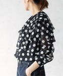 【ドットヨーリューフリルブラウス◆】 3段フリルが華やかな、1枚で着映えするドットブラウス。 軽く、さらりとした素材感がこの時期にピッタリです。 パッと目を惹く大きめのドットが、コーディネートにアクセントをつけてくれます。 サロペットと合わせてカジュアルダウンさせた着こなしに。 ベレー帽やショートブーツで小物で秋らしさを取り入れました*