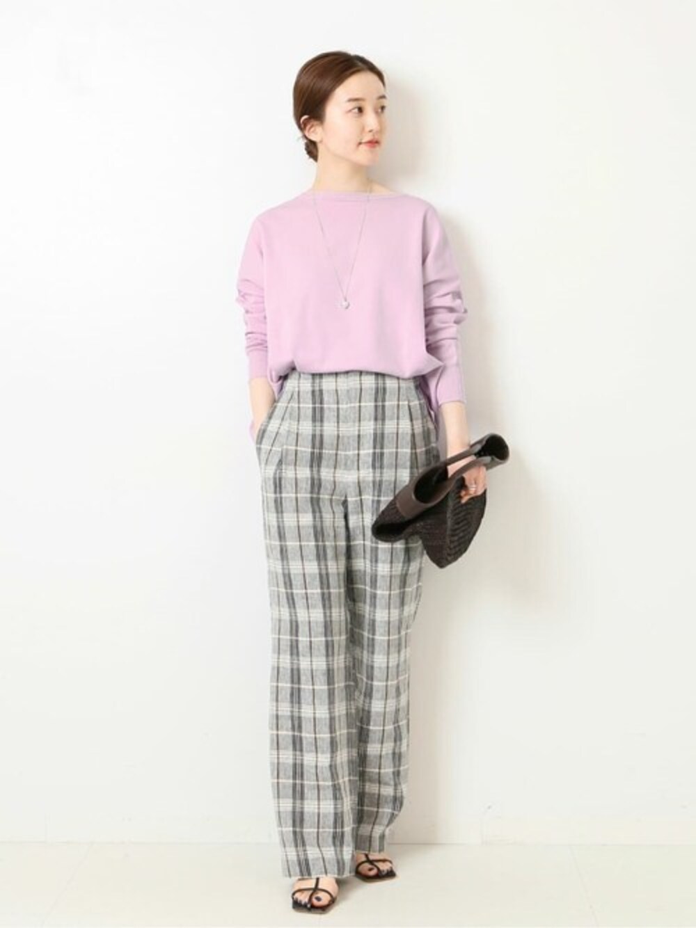 コットンストレッチNEOワイド長袖プルオーバー 身長:162cm/体型:細身/骨格:ウェーブ/普段のサイズ:S/着用サイズ:free/パーソナルカラー:イエベスプリング コットンにストレッチ性のあるポリエステルが入っているので着心地がとてもよく、型崩れしにくい素材です。イージーケアでお手入れも簡単にできるのも嬉しいポイント。生地の厚さも程よく軽やかな素材なので初夏まで着ることができます。 フレンチリネンストレートパンツ 身長:162cm/体型:細身/骨格:ウェーブ/普段のサイズ:S/着用サイズ:36/パーソナルカラー:イエベスプリング ウエストにはカットソーを綺麗にイン出来るくらいのゆとりがあり、丈もあるので少しゆったりとしたシルエット。少し膝のあたりをスリムなパターンにしているストレートなので、ラインがきれいに見えました。またフラットシューズで履くと床につくかつかないかギリギリの長さでした。 ハリは無く、くたっと柔らかい手触り。比較的薄手の生地なので春から真夏まで着れます。