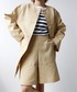 二重織ギャバBOXYコート 身長:162cm/体型:細身/骨格:ウェーブ/普段のサイズ:S/着用サイズ:38/パーソナルカラー:イエベスプリング コットンの表面感が滑らかで見た目以上に軽いボックスシルエットのコート。横から見て厚みがでないようなパターンでシルエットも気にせず着ることが出来ました。大きな貝ボタンや新鮮な短めの丈感も可愛いです。中も着込みやすいぐらいゆとりもあり、大きすぎない絶妙なサイズ感がよかったですが、36サイズのがスッキリきれい目な印象で着れると思います。春らしい柔らかいトーンのイエローが素敵でした。 二重織ギャバBOXYショーツ 身長:162cm/体型:細身/骨格:ウェーブ/普段のサイズ:S/着用サイズ:36/パーソナルカラー:イエベスプリング スカートのようなフォルムで着ることができ、ジャストウエストで腰回りはすっきりとし、パンツの筒が太いので足元や膝が見えるバランスが良く、大人が着用しても上品に見えるデザインです。コットンの表面感が滑らかで見た目以上に軽く、履きやすいです。サイズは36でジャストでした。