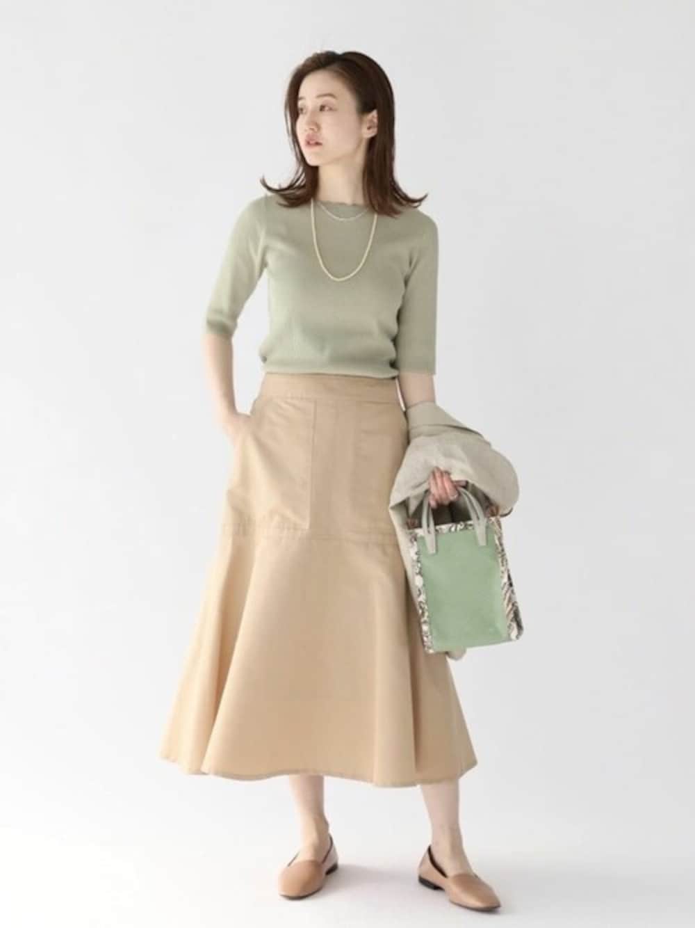 T/Cグログランデザイントラペーズスカート 身長:162cm/体型:細身/骨格:ウェーブ/普段のサイズ:S/着用サイズ:36/パーソナルカラー:イエベスプリング 程よくハリのあるグログラン素材で履くと一枚で着映えするスカート。スカートの生地も程よい厚みがあるので、身体のラインを拾いにくく、形もとてもきれいでたっぷり揺れる裾が女性らしい雰囲気でした。ウエストはゆとりはありましたが腰でとまり、トップスがインできるぐらい。長さは36サイズでちょうど良い印象です。きれいめやカジュアルなスタイリングにも合わせやすく、幅広く使いやすいです。 レーヨンコットン RIB クルーネック プルオーバー 身長:162cm/体型:細身/骨格:ウェーブ/普段のサイズ:S/着用サイズ:free/パーソナルカラー:イエベスプリング ドライタッチな着心地もよく、伸縮性もあるので身体のラインも拾いすぎずスッキリ見えするリブです。どちらを前にしても品のある控えめな肌見えで繊細な襟ぐりディティールも素敵でした。
