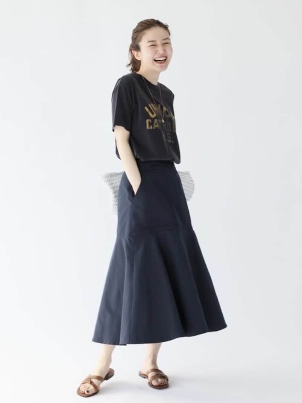 T/Cグログランデザイントラペーズスカート 身長:162cm/体型:細身/骨格:ウェーブ/普段のサイズ:S/着用サイズ:36/パーソナルカラー:イエベスプリング 程よくハリのあるグログラン素材で履くと一枚で着映えするスカート。スカートの生地も程よい厚みがあるので、身体のラインを拾いにくく、形もとてもきれいでたっぷり揺れる裾が女性らしい雰囲気でした。ウエストはゆとりはありましたが腰でとまり、トップスがインできるぐらい。長さは36サイズでちょうど良い印象です。きれいめやカジュアルなスタイリングにも合わせやすく、幅広く使いやすいです。