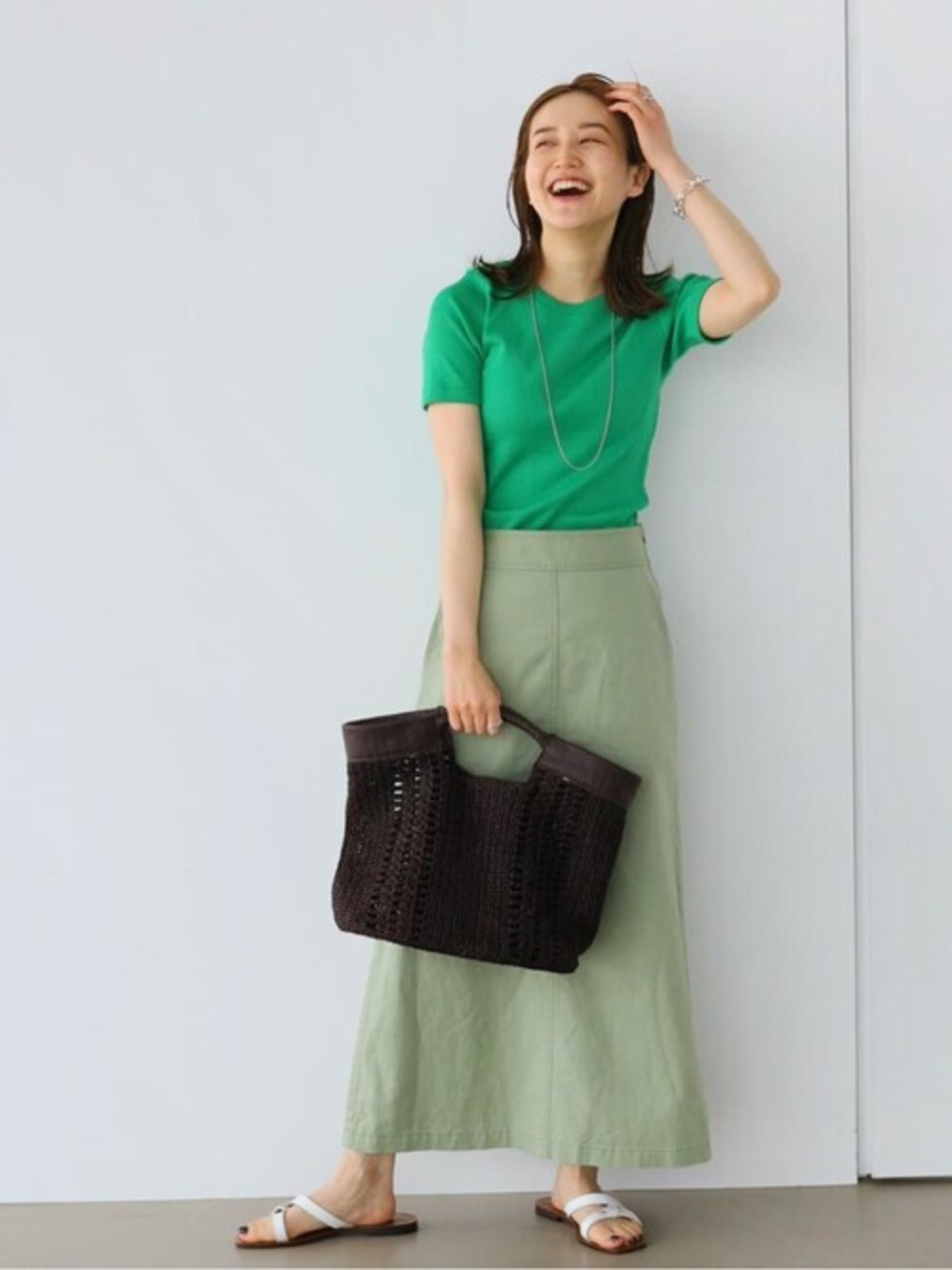 【AURALEE/オーラリー】IENA 別注 LUSTER リブ Tシャツ 身長:162cm/体型:細身/骨格:ウェーブ/普段のサイズ:S/着用サイズ:free/パーソナルカラー:イエベスプリング カットソーですが、細いリブと微光沢な素材なのできちんと感が出ます。コンパクトでスッキリとしたシルエットですが、柔らかい素材なので身体に馴染みがよく、窮屈感はありませんでした。初夏にピッタリの鮮やかグリーンは夏の日差しに映えること間違いなしです! コットンリネンオックストラペーズスカート 身長:162cm/体型:細身/骨格:ウェーブ/普段のサイズ:S/着用サイズ:36/パーソナルカラー:イエベスプリング 程よい厚みとハリ感、清涼感あるドライタッチな素材。華奢見えしそうなトラペーズスカートでシルエットがとてもきれいです。ウエストはカットソーがインできるぐらいのゆとりがあり、長さも踝が見えるぐらいの丈でした。