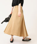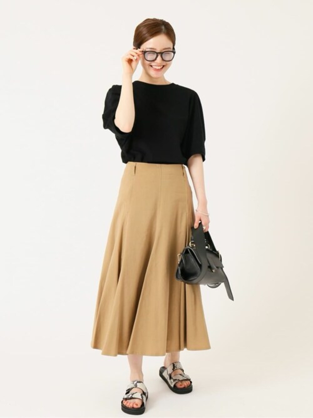 パネルフレアボリュームスカート 身長:162cm/体型:細身/骨格:ウェーブ/普段のサイズ:S/着用サイズ:36/パーソナルカラー:イエベスプリング スカートの生地も程よい厚みがあるので、身体のラインを拾いにくく、形もとてもきれいでたっぷり揺れる裾が女性らしい雰囲気でした。ウエストは後ろはゴムになっているのでイージーな履き心地でトップスがインできるぐらい。36サイズでちょうど良い印象です。麻が入っているので涼しく、きれい見えからカジュアルなスタイリングにも合わせやすく、幅広く使いやすいです。