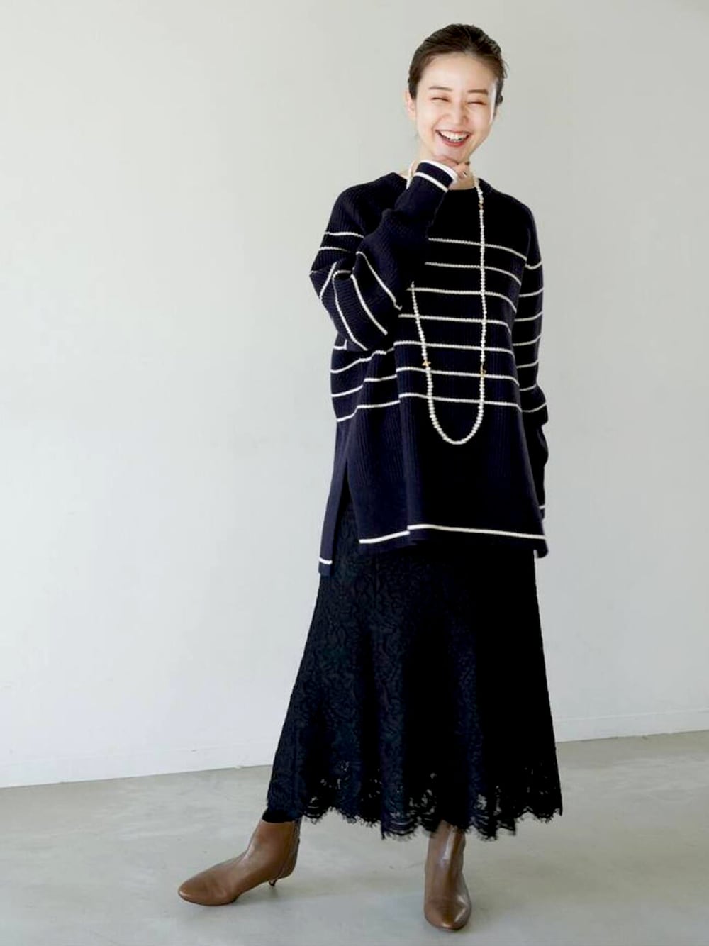 身長:162cm/体型:細身/骨格:ウェーブ/20代後半/普段のサイズ:S/パーソナルカラー:イエベスプリング 【ウールナイロン畦ボーダープルオーバー】 着用サイズ:フリー クルーネックの首の詰まり具合が可愛く、肩がストンと落ちるので、 着丈はありますがサイドのスリットも入ってスッキリとしたシルエットが素敵ですよね* 身体のラインも拾いすぎないので幅広い体系の方にマッチしやすいデザインなのも嬉しいポイントです。 スカートと合わせてストンと落ちてくれるシルエットが好相性◎ 長さがしっかりあるのでパンツ合わせももちろん素敵です! 今の時期、プラスで一枚買い足したくなる、そんなおすすめのニット!