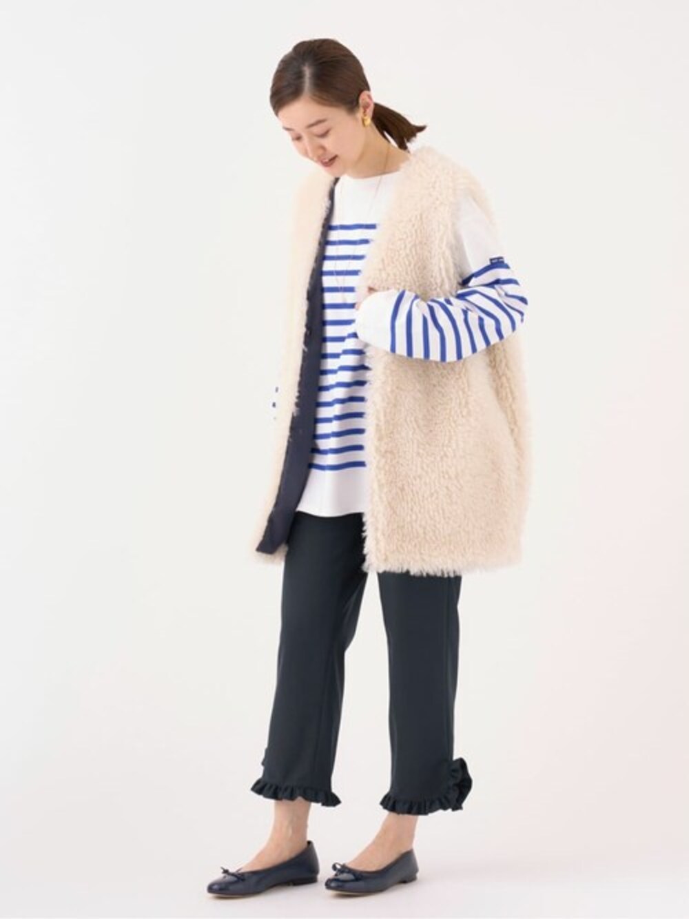 カーリーファーベスト 身長:162cm/体型:細身/骨格:ウェーブ/普段のサイズ:S/着用サイズ:F/パーソナルカラー:イエベスプリング 一枚で着映えするカーリーファーベスト。重さもそこまで気にならず、毛がカールしているので柔らかい印象になります。着丈はヒップまで隠れる長さ。ブラウス、カットソーどちらでも可愛いです。