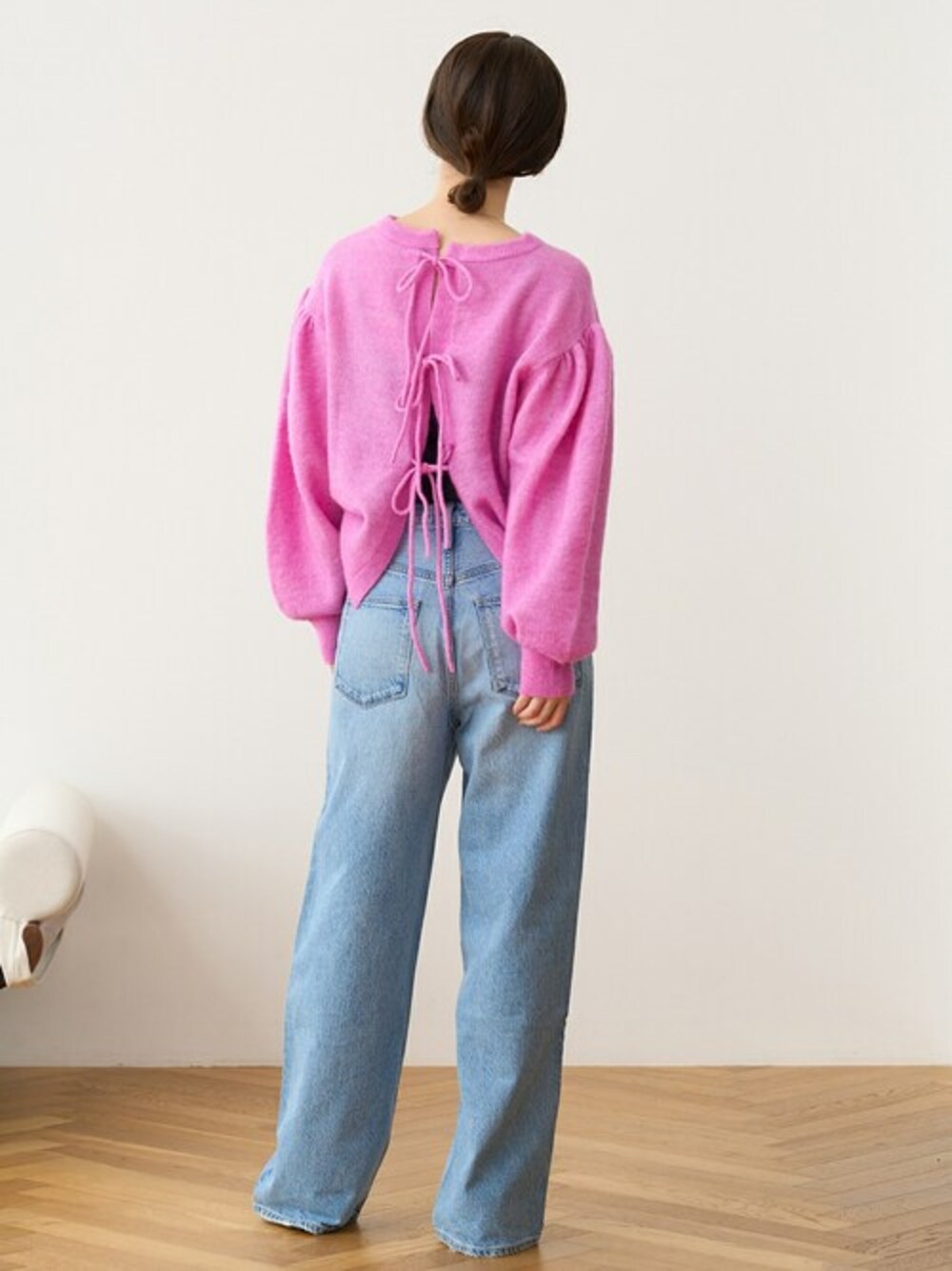 モヘア天竺リボンカーディガン ピンクのカラーが華やぐ一枚。形も可愛く、首元もインナーなどが見えにくい開きになっており、袖口のボリューム感も好きです。2wayで着ることができ、雰囲気も変化することが可能です。素材感は暖かく、毛足がしっかりしているため個人的には中に長袖のtシャツを入れて着ることはおすすめしたいです。