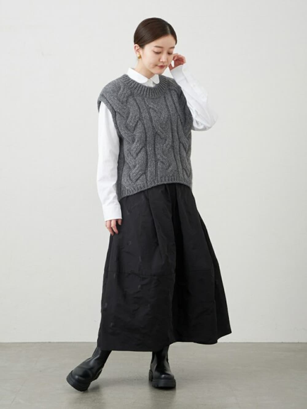 身長:162cm/体型:細身/骨格:ウェーブ/普段のサイズ:S/着用サイズ:F/パーソナルカラー:イエベスプリング 【ビックケーブルニットベスト】 ざっくりとした編みがかわいいニットベストは、とても軽くてふわふわの着心地♪ 季節の変わり目に+1するだけでこなれ感がアップするので、持っておいて損なしです。 後ろのさりげないリボンが大人かわいくてきゅんとするポイント◎ 【ドットタフタスカート】 タフタ素材でメモリー感のある素材は、フォルムの出るシルエットが存在感があって素敵! さりげないドット柄がスタイリングにほんのりアクセントをプラスしてくれます。 ウエストには少しギャザーが寄ったようなデザインが施されており、インスタイルも品よくまとまるところがお気に入りです♪