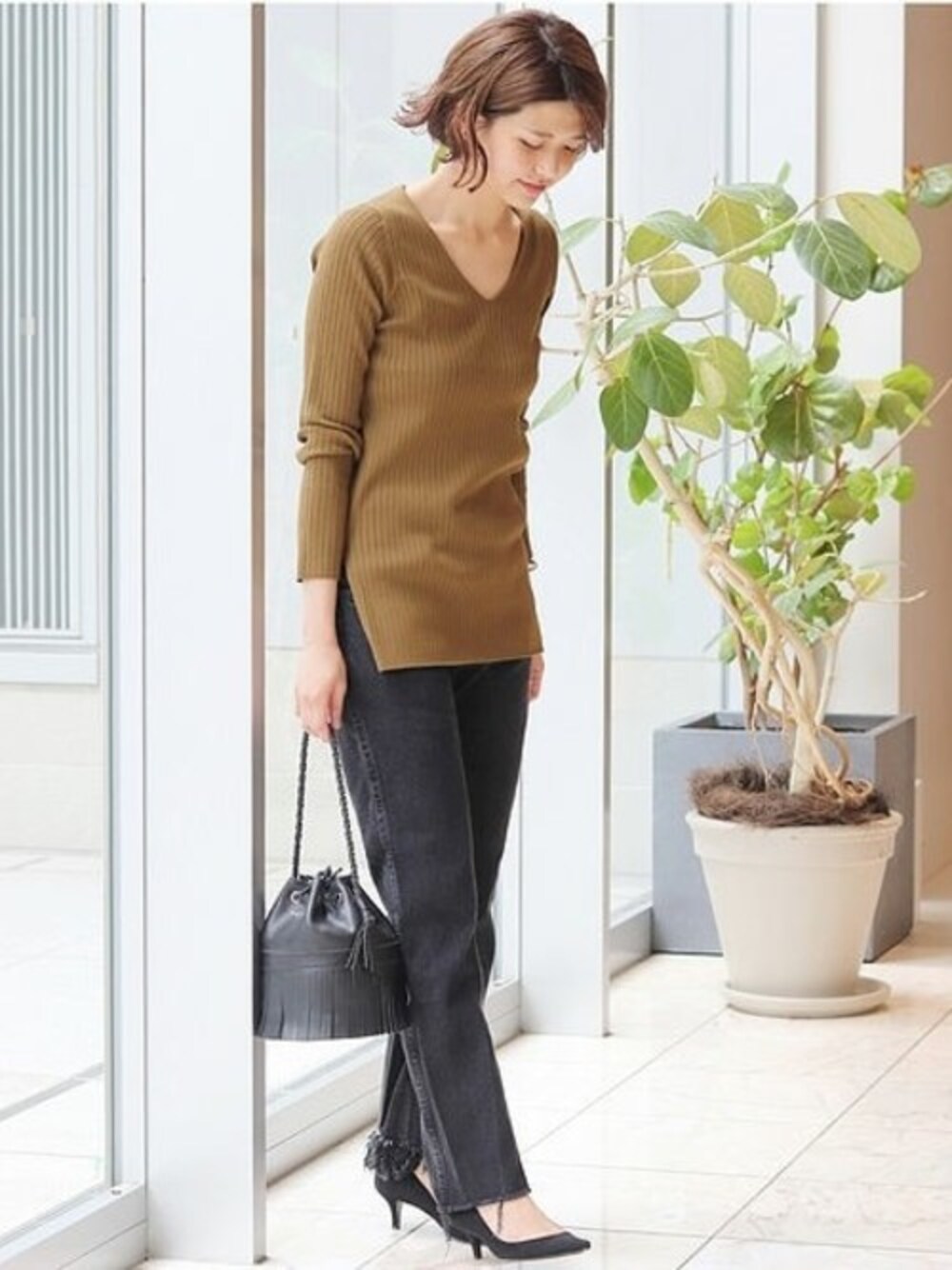 滑らかな質感のリブニットは発色良く、マスタードカラーがスタイリングを秋らしく演出します。 サイドスリットが腰から足先まですらりと見せ、きれいめなデニムスタイルに。