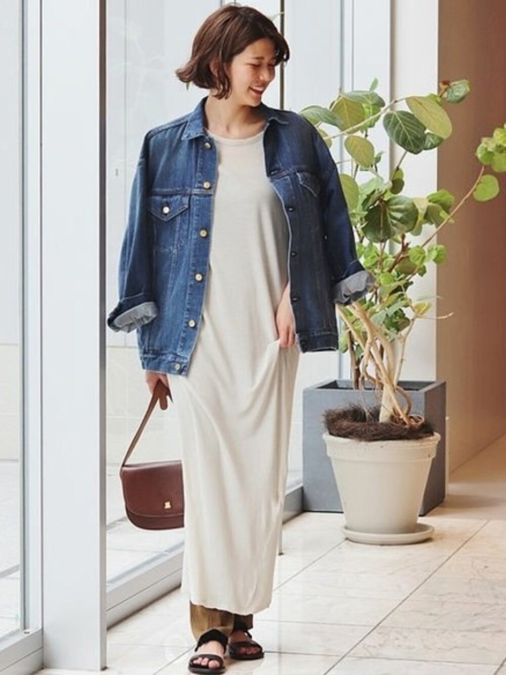 くたっとしたニュアンスがポイントのワンピース。 ロング丈ワンピースにリブパンツをさらにレイヤードした旬な着こなしに。