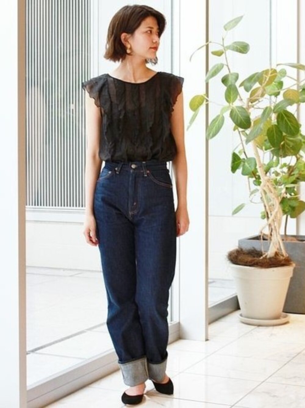 シアー感が上品なフリルブラウス。 お気に入りのデニムにきゅっとインして。