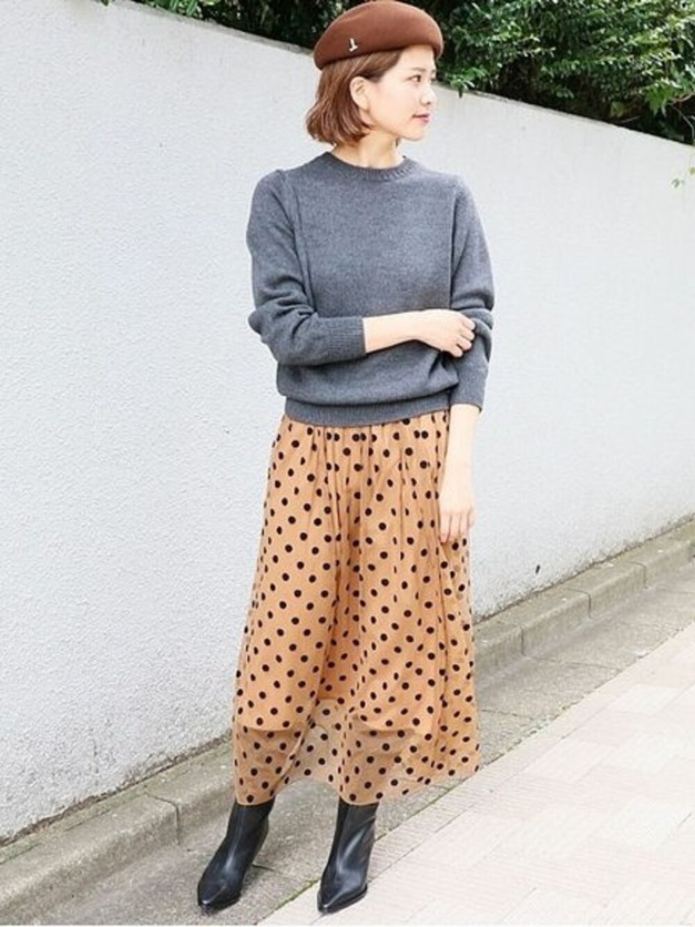 天竺のシンプルニット。 少しコンパクトなデザインながら体のラインを拾いにくい程よいミドルゲージで気負いなく着こなせます。 ドットのチュールスカートと合わせてレディライクに。 軽やかな素材のスカートだからこそ、ブーツとの相性も抜群です。