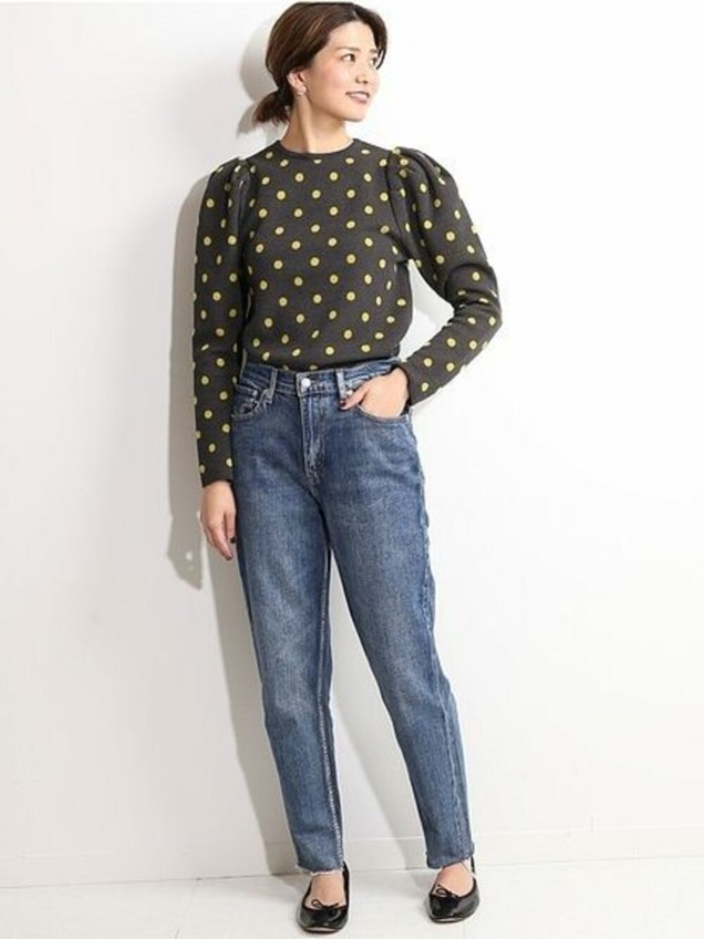今年らしいドットのニットは、デニムを合わせてシンプルに。 程よく丸みを帯びた肩のディテールにも注目です。