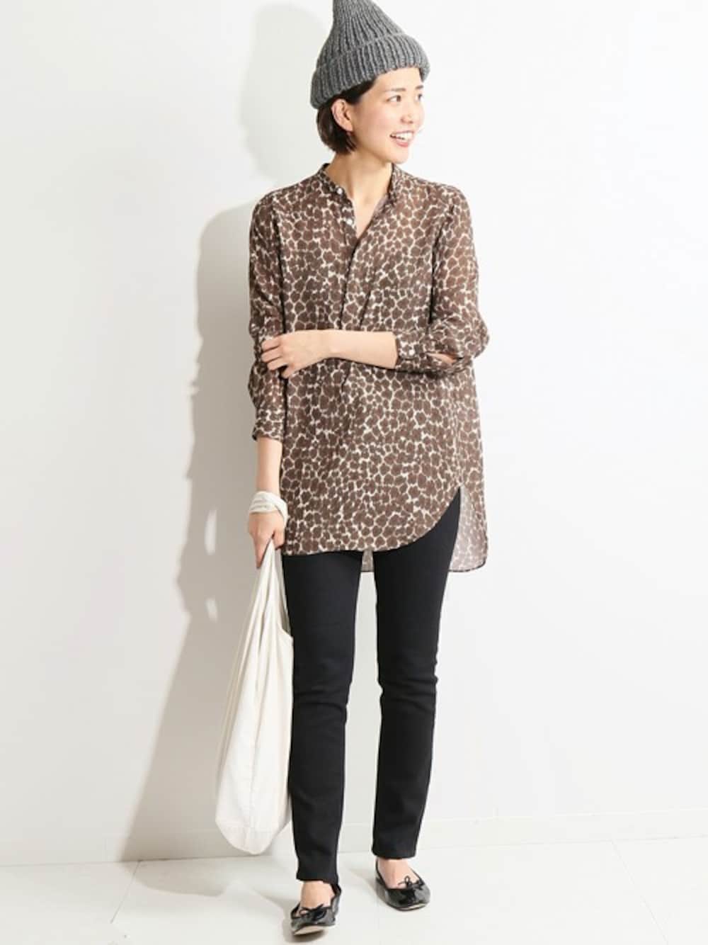 今季注目のレオパード柄が楽しめるシャツ。 すっきりとしたバンドカラーは大人っぽさを引き出します。 1枚着はもちろん、ニットのインナーに取り入れて、さりげなくトレンドを楽しむのもオススメ。