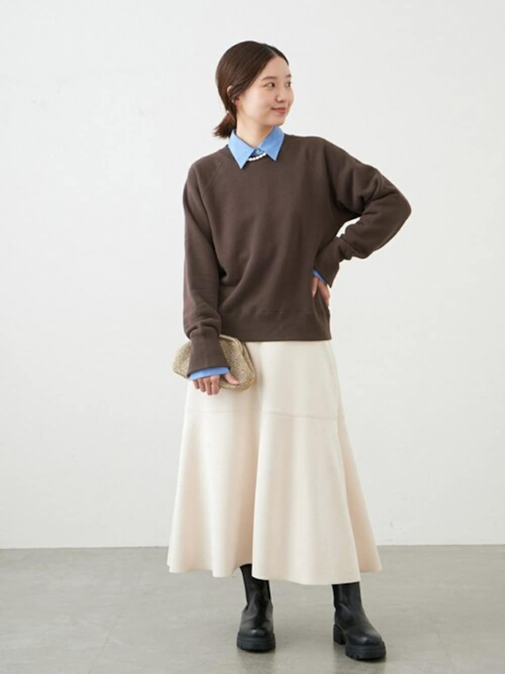 身長:160cm / 体型:普通 / 普段サイズ:36.38 / パーソナルカラー:イエベ秋 【裏毛コンパクトスウェット】 コンパクトシルエットでスカート合わせがバランスよく、 フェミニンにも着られるので気に入っています。 首元はシャツとパールをレイヤードして少し盛るのが気分! こっくりとしたブラウンカラーも秋らしくて良いですね*