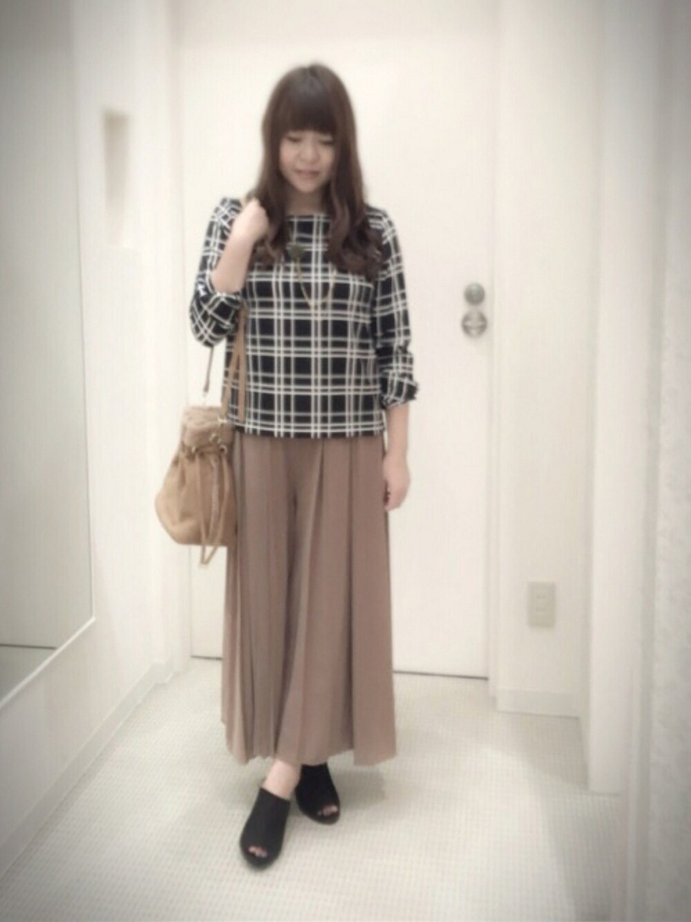 チェック柄のブラウスにプリーツスカンツ合わせ✩⡱ このブラウス、袖がリボンに❤️❤️ スカンツは、部分的にプリーツに。 スッキリしたシルエットがお気に入り🎶