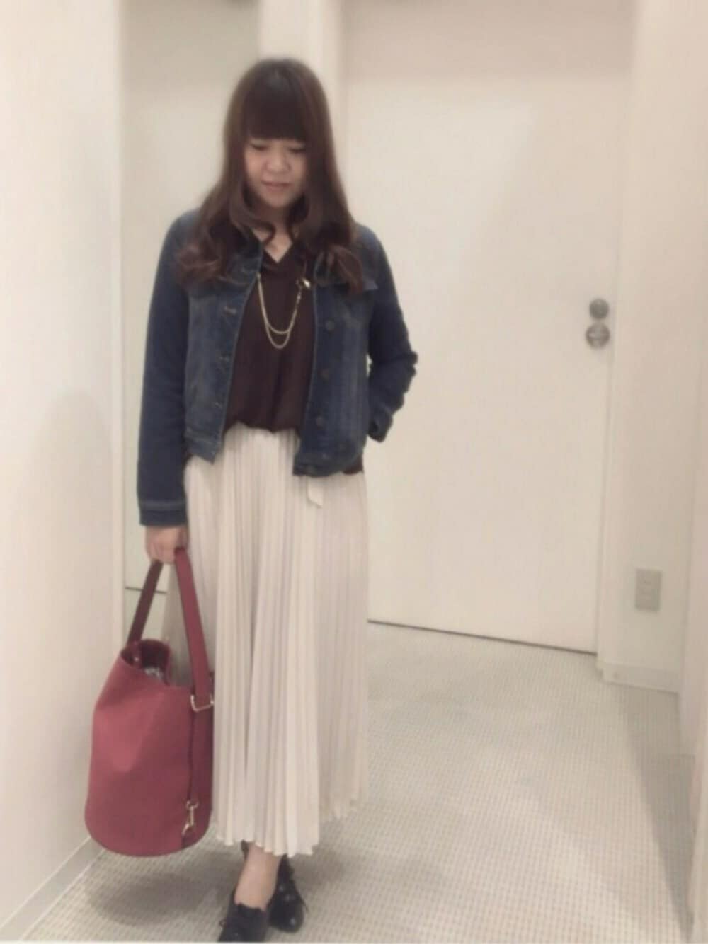 Vネックブラウスにプリーツスカート✩⡱ トップスのブラウスは、とろみ素材で微光沢🙃 プリーツスカートは広がらずスッキリしたシルエットでした¨̮♡