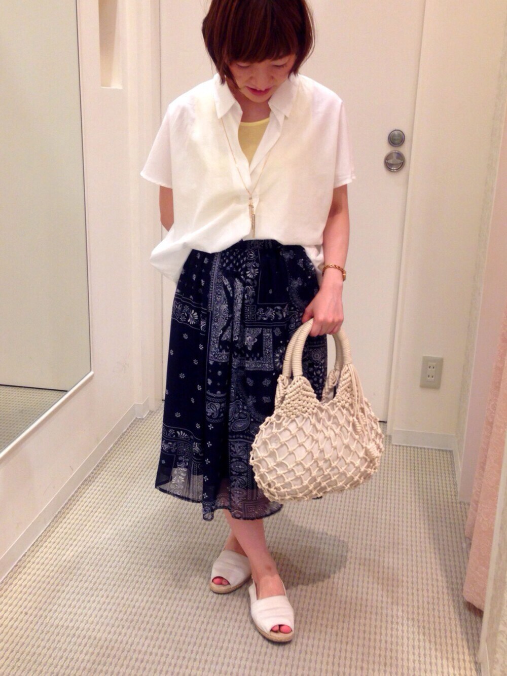INGRID つくば店です。 バンダナ柄が今年らしいです◎ 柄物はあまり着用しませんが、 夏になると柄物を着たくなります! スカートがメインになるコーデにしました。