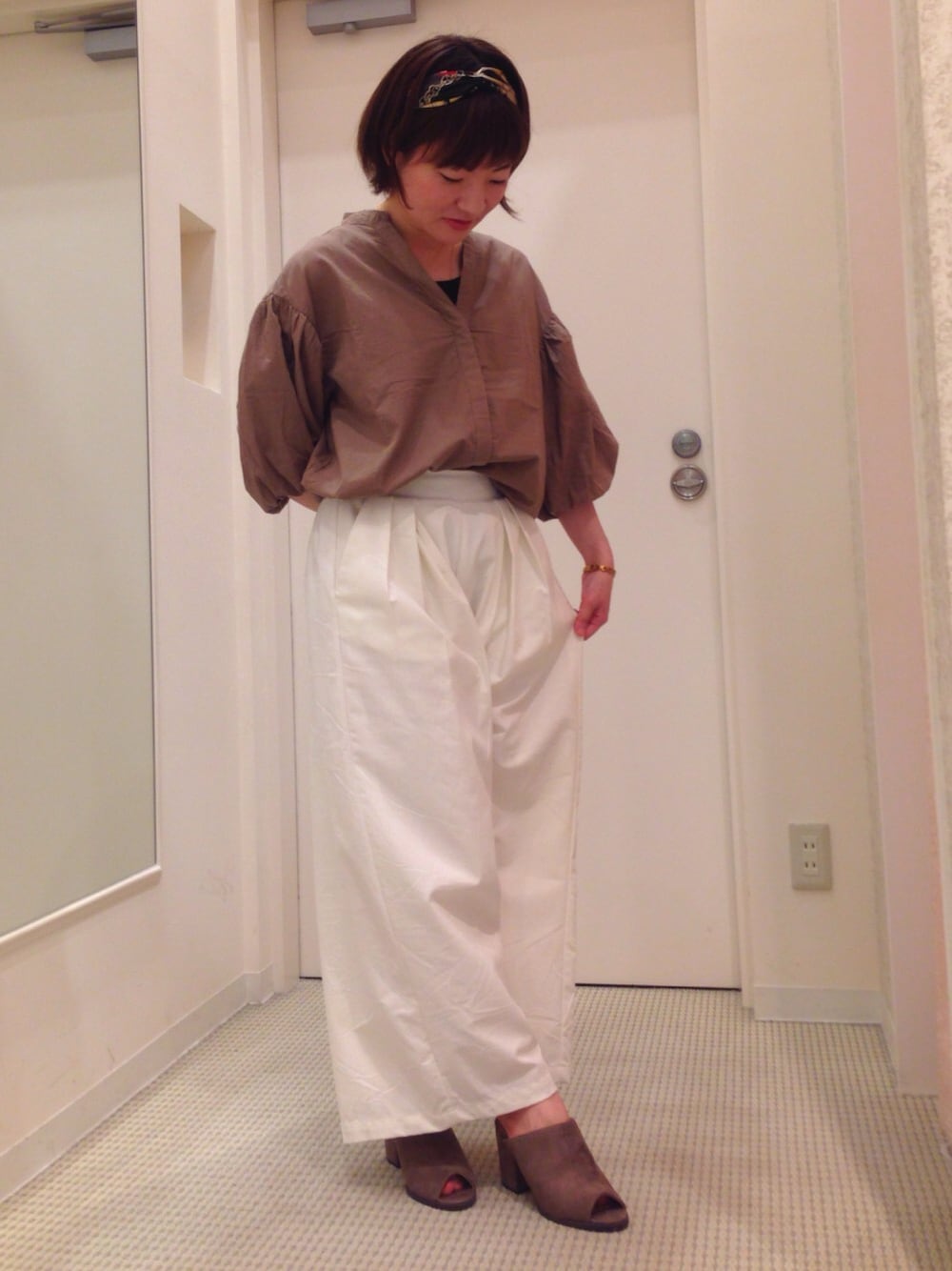 INGRIDつくば店です。 アースカラーを取り入れたコーデに挑戦。 ボリュームのあるお袖がキュートです。 7月に入って急に暑くなったので… 麻素材のパンツとインナーには接触冷感タンクを合わせました◎