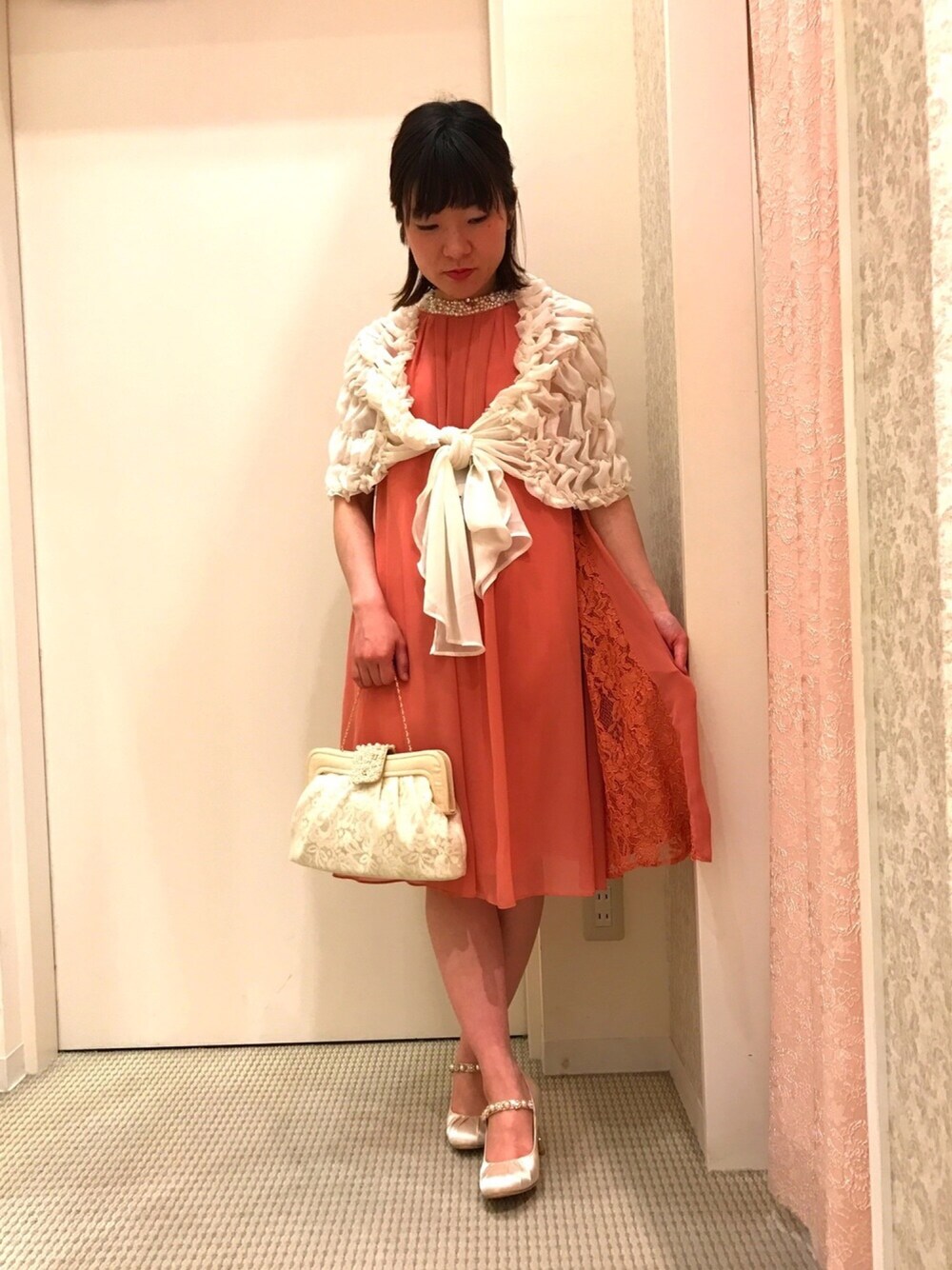 INGRIDつくば店です。 春に合わせたパーティスタイルです。 サイドがレース使いの Aラインワンピース♡ 程よい裾の広がりが フワフワで可愛いです! 肌馴染みの良い サーモンピンクで写真映りも 綺麗な仕上がりに◎ 謝恩会シーズン 春の結婚式にオススメです。