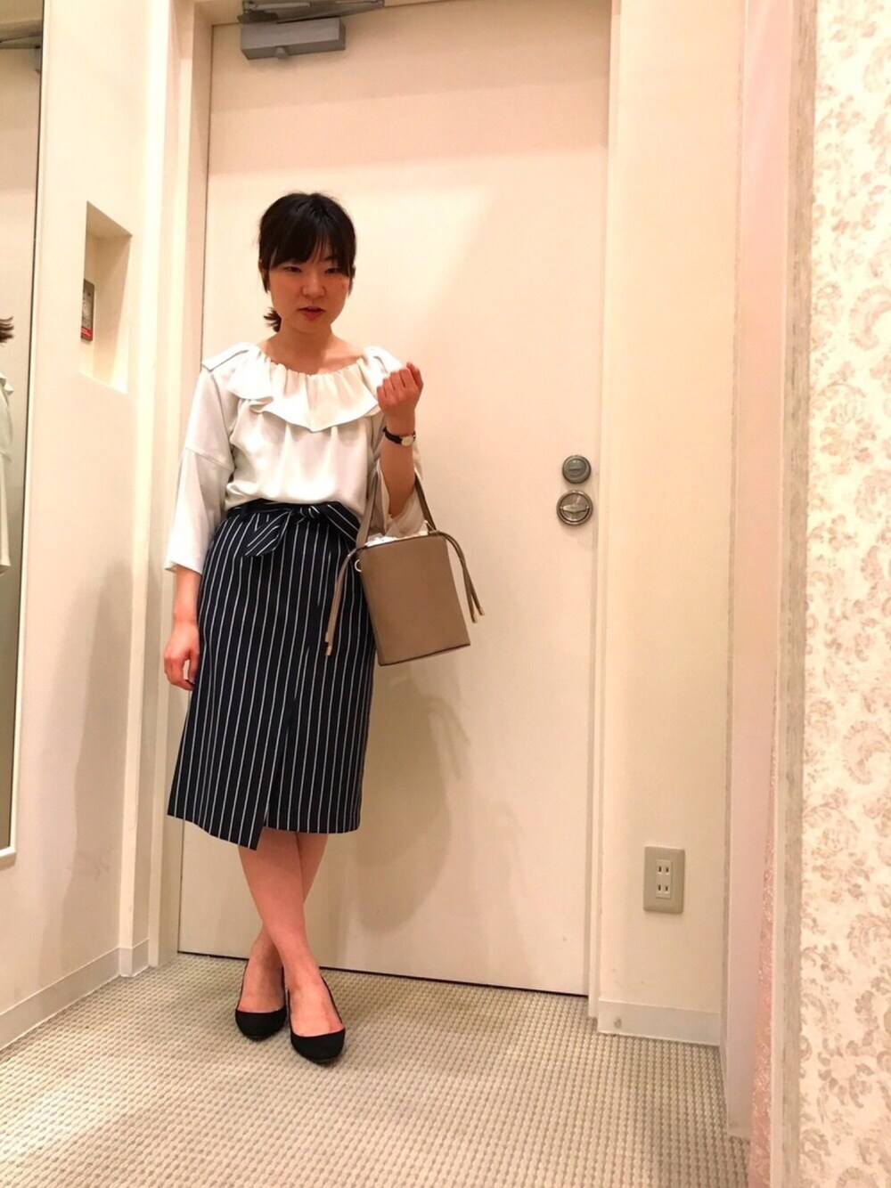 INGRIDつくば店です。 流行を取り入れた 綺麗目コーデにしました。 春のお出かけにもピッタリ! ラッフルフリルが軽やかで カワイイです♡ スリットが入っているスカートなので 動きやすくて快適です◎ ストライプ柄で 甘さを抑えました。
