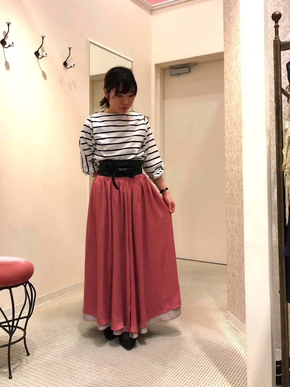 INGRIDつくば店です。 鮮やかな色にチャレンジしました。 着たことない色も たまにはいいカモしれません。 このスカートリバーシブルで ご利用いただけます◎ もう一方はベビーピンク色です♡ 気分に合わせて 使い分けられますね。 サッシュベルトをワンポイントに。 巻くだけで今年らしさ出ます☻