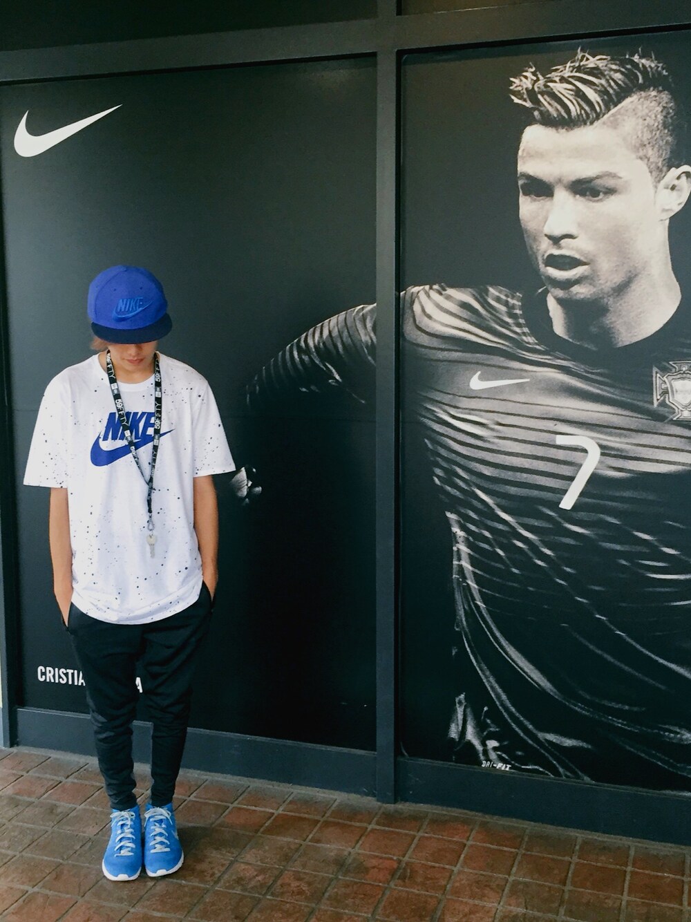 ナイキ×青コーデ! このシャツ日本じゃ売ってないみたい😍 バックプリントがoff whiteオマージュでかっこいいです👍